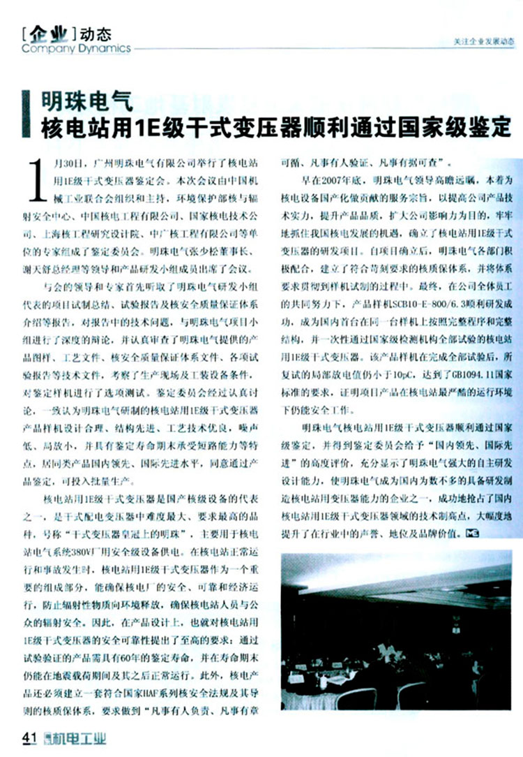 明珠電氣核電站用1E級干式變壓器順利通過國家級鑒定