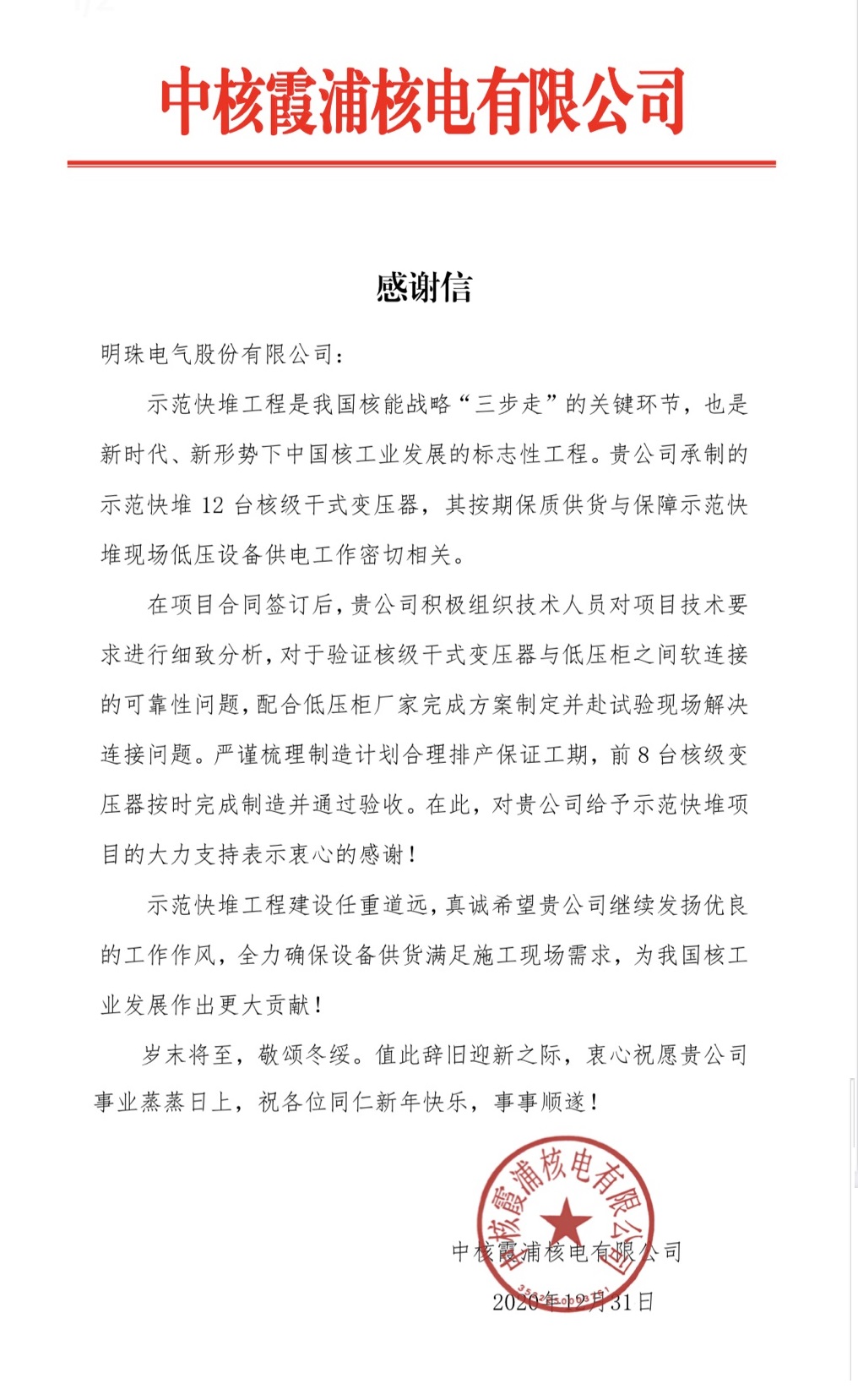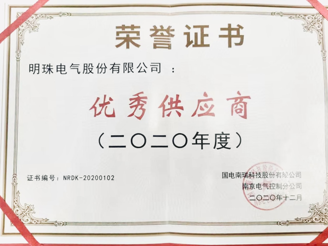 2020年收官之際,明珠電氣收到來自不同客戶的感謝與表彰。中核霞浦公司感謝我司卓越的產品交付和技術服務;國電南瑞授予我司2020年“優秀供應商”榮譽稱號。 客戶的贊賞就是每一位明珠人的高光時刻,我們感恩客戶給予的成長機會,也自豪于明珠人交出的一份份優異答卷。